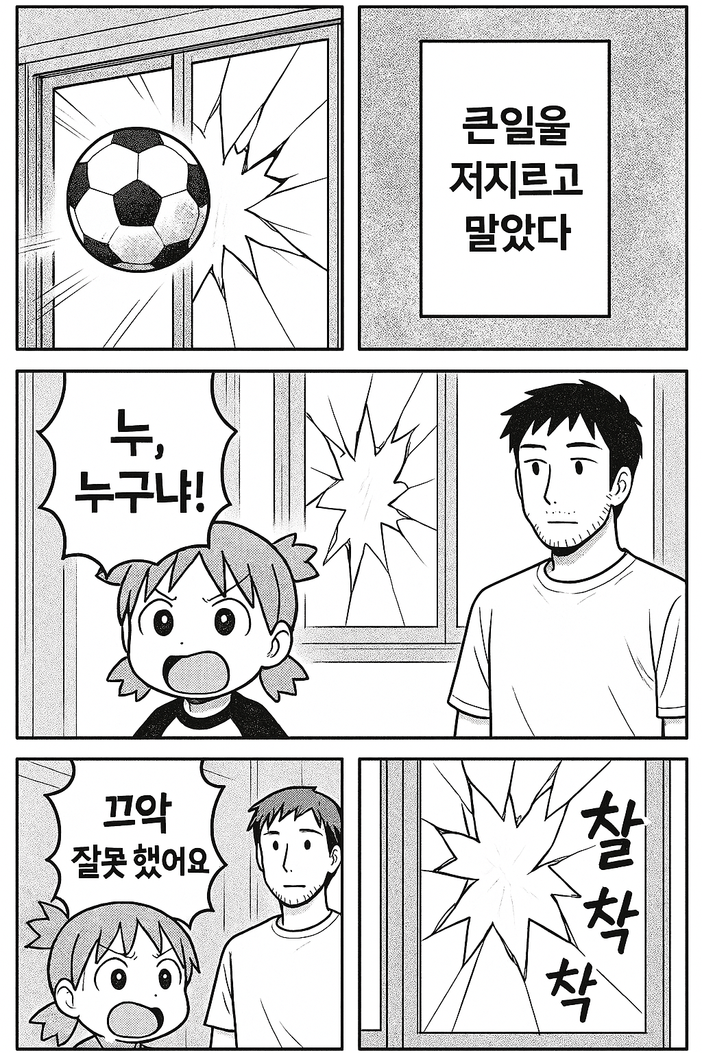 - 4컷: 깨진 창문이 보여지며 의성어로 "끄악 잘못 했어요", "찰싹", "찰싹", "찰싹"